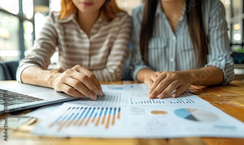 Colleagues Collaborating on Finances - Asian Business Partners Analyzing Documents, Discussing Using Laptop at Modern Office