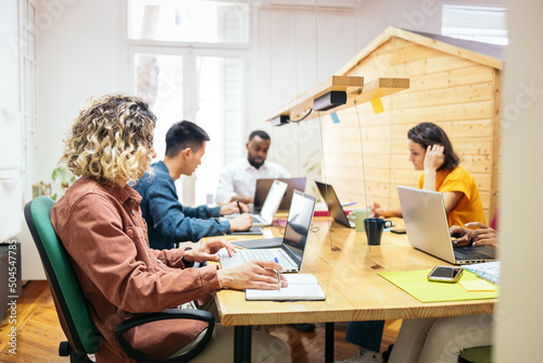 Colleagues co-working with laptop in the office
