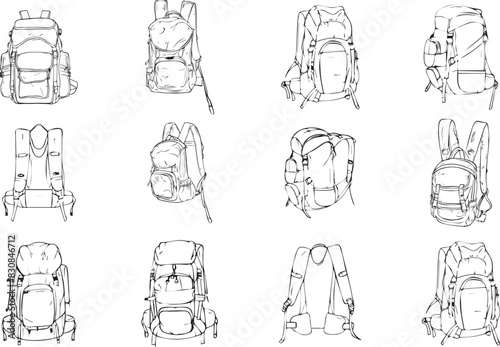 Collection of Hiking Backpack bag flat sketch fashion illustration drawing template mock up isolated on white background