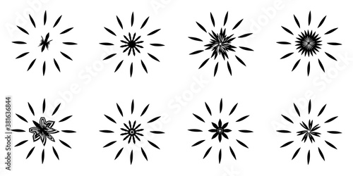 Collection black color element icons of sun stars radial starburst with creative flower banner logo decoration icons vector illustration, abstract background texture wallpaper pattern seamless art gra