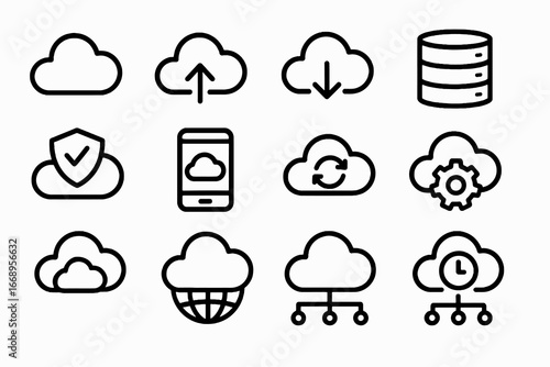 Collection of 12 black cloud computing and backup icons in flat vector style with white background, ideal for technology apps, software, and digital tools.