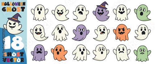 Collection of 18 cute and spooky cartoon ghosts with various expressions and halloween hats for festive decoration and design elements