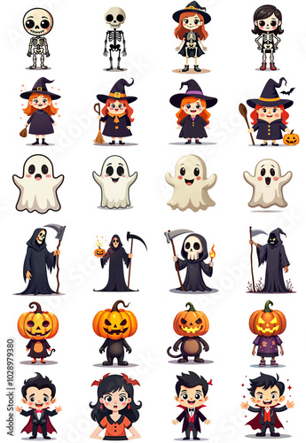 Collection of 24 isolated halloween characters with no background. Set of cute creatures including ghost, witch, grim reaper, pumpkin, monster and vampire