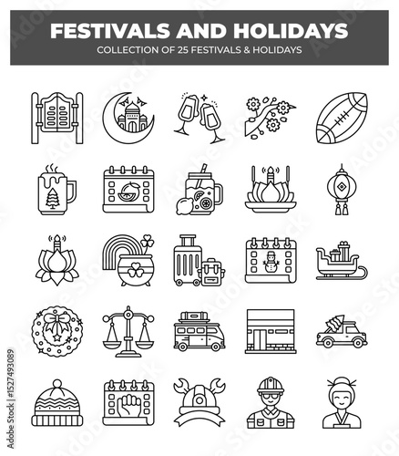 Collection of 25 Festivals and Holidays. Line Art Icons