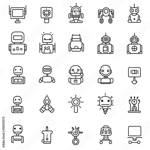 Collection of 25 simple line art robot icons.