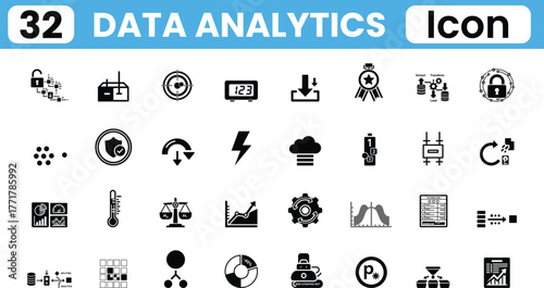 Collection of 32 data analytics icons representing various business and technology concepts for digital design