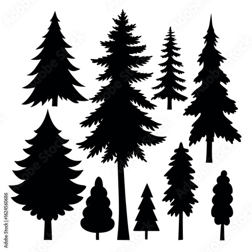 Collection of 7 evergreen tree silhouettes isolated on white background