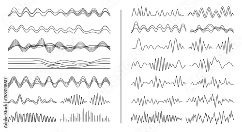 Collection of abstract soundwave visualizations showing various frequency and amplitude patterns
