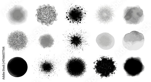 Collection of Abstract Splatter Ink Blots and Brush Strokes in Various Textures and Shades of Gray