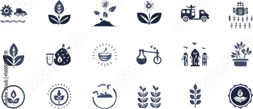 Collection of agriculture and nature related icons depicting farming and plant life elements and symbols | editable eps vectors silhouette