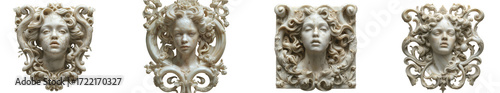Collection of ancient stone sculptures of female faces with ornate hair, isolated on transparent background