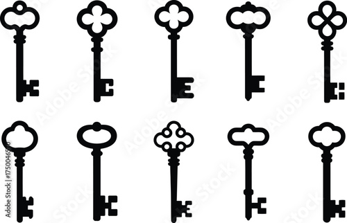Collection of antique keys in black and white isolated on white background