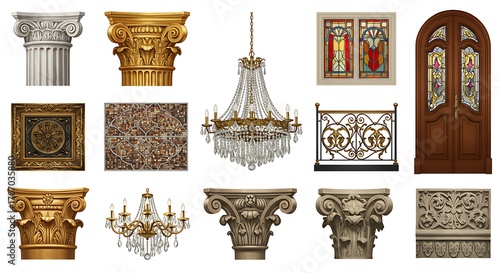 Collection of architectural elements and decorative items, including ornate capitals, stained glass windows, chandeliers, and carved panels