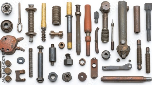Collection of assorted old metal fasteners and mechanical parts arranged on a white background