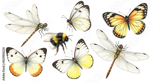 Collection of beautiful flying insects including butterflies dragonflies and a bumblebee on white background