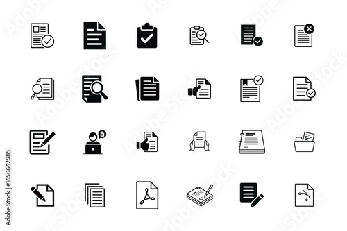 Collection of black and white document icons representing various file management and paperwork tasks for business and personal use