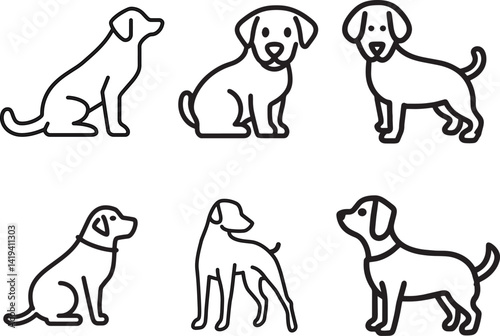 Collection of Black and White Dog Outlines in Various Poses for Minimalistic Pet Designs