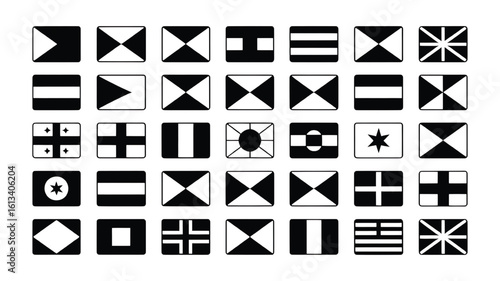 Collection of black and white flags and icons representing various nations and organizations with geometric shapes