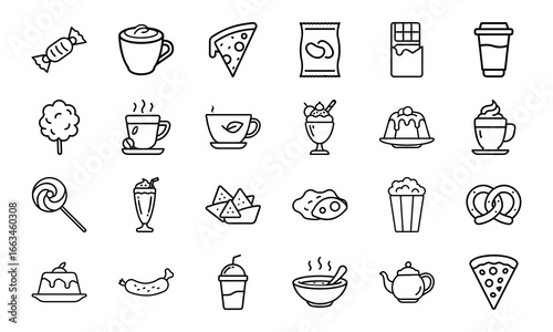 Collection of black and white food and drink icons, coffee, tea, candy, chocolate, ice cream, snacks, pizza, popcorn, pretzel, sausage, fried egg, milkshake, cold drinks, breakfast and dessert line ve