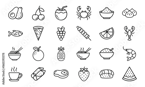 Collection of Black and White Food Icons – Fruits, Drinks, Seafood, Noodles, Pizza, Meat, Desserts, and Bakery Line Vector Illustrations for Restaurant, Cafe, and Food Blog Design