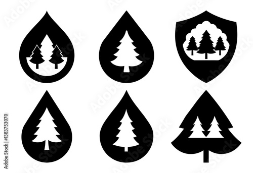 Collection of Black and White Forest and Water Drop Icons Representing Nature Conservation