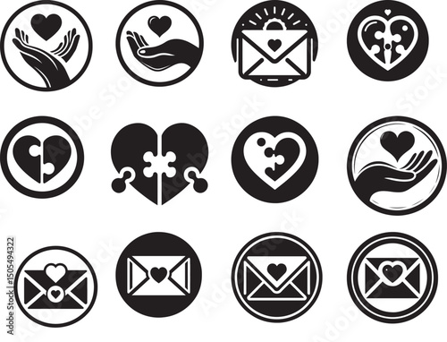 Collection of black and white love and connection icons featuring hearts hands and envelopes in circles