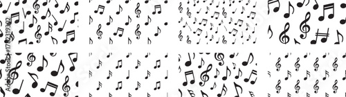 Collection of black and white music notes background, symbolizing musical composition, vector art.