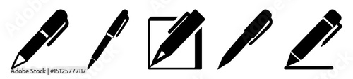 Collection of Black and White Pen Icon Set for Writing and Marking
