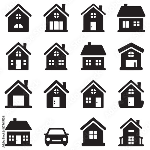 Collection of black and white silhouette icons representing various styles of houses and a car