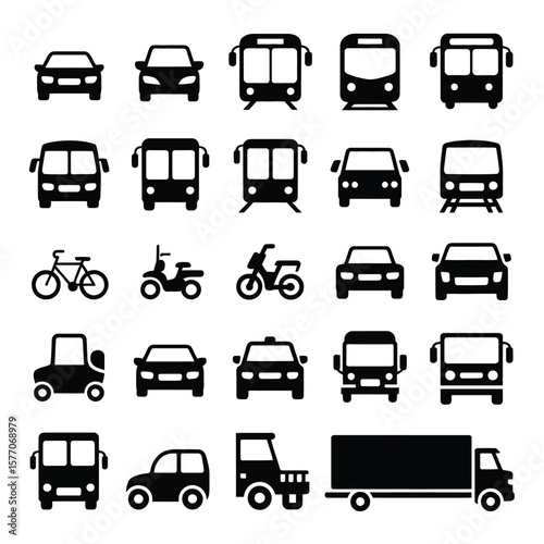 Collection of Black and White Transportation Icons Illustrating Various Vehicles Including Cars Buses Trucks Motorcycles Bicycles and More Shown in Front View Simple Graphic