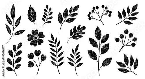 Collection of black botanical elements with textured stems and leaves ideal for vintage designs