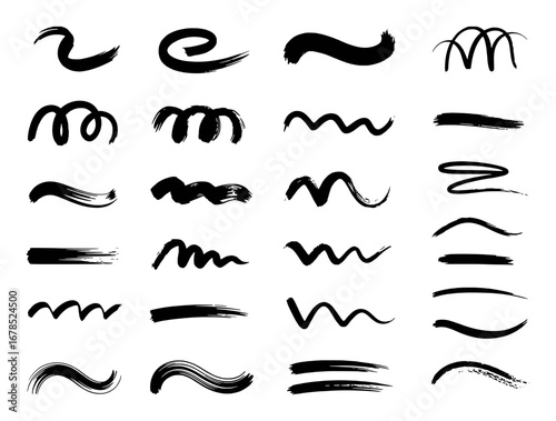 Collection of Black Brush Stroke Lines and Swirls on White Background