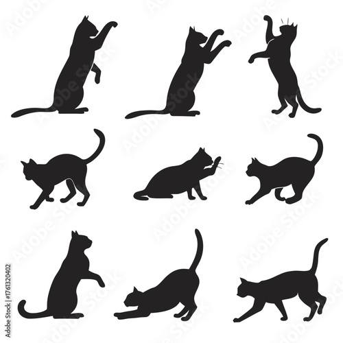 Collection of black cat silhouettes in various playful and active poses on white background