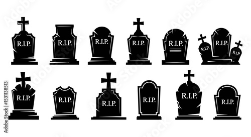 Collection of Black Gravestone Silhouettes with R.I.P. Inscriptions and Crosses