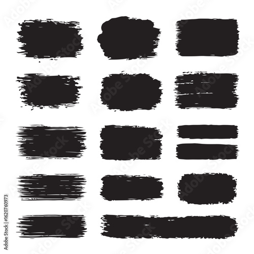 Collection of black grunge paint brush stroke textures and splatters on white background