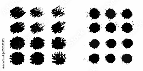 Collection of black ink brush stroke circles and textured paint splatters on white background