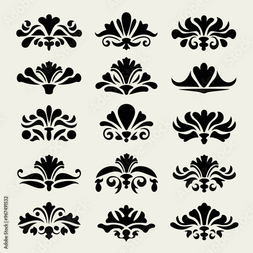 Collection of Black Minimal Ornate Design Elements with Crown Accents..
