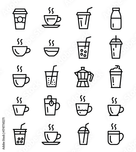 Collection of Black Outline Icons for Hot and Cold Beverages coffee drink