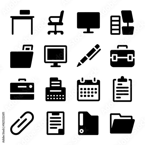 collection of black silhouette vector office equipment and stationery icons for workspace organization