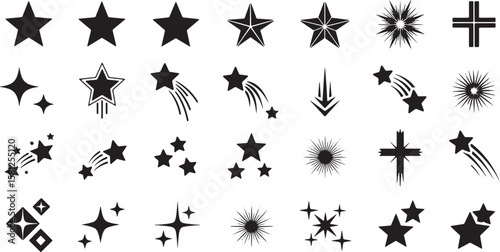Collection of black star shapes and sparkling icons isolated on white background isolated on transparent background silhouette