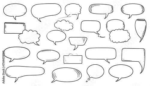 Collection of black-outlined speech bubbles, various shapes, sketched in doodle style on a white background