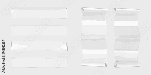 Collection of blank white banners and scrolls in various shapes and sizes on a light gray background