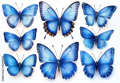 Collection of Blue Butterflies Watercolor Illustration Spring Design Elegant Art