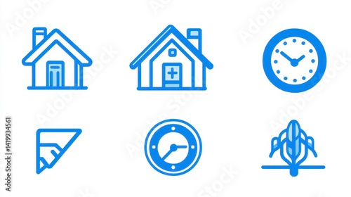 Collection of blue line art icons depicting houses, clocks, and a rocket. Simple and minimalist style.