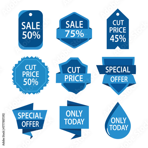 Collection of blue sale and discount badges isolated on white background for promotional marketing campaign