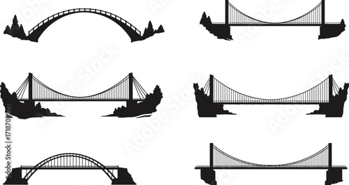 Collection of bridge silhouettes including suspension, arch and cable designs, black vector illustrations for architecture, construction, infrastructure and engineering concepts