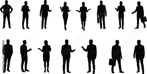 Collection of business people silhouette poses in formal office clothing standing, talking, walking, holding briefcase for corporate design vector illustration