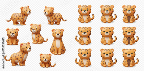 Collection of cartoon leopard cubs in various poses, some standing and some sitting, on a transparent background.