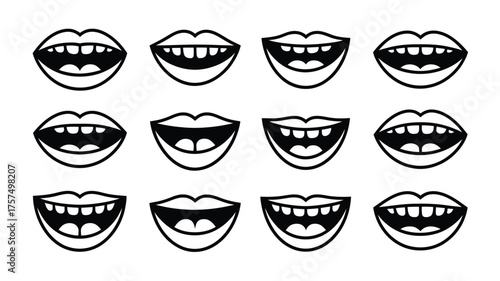 Collection of cartoon mouths with various teeth and expressions in a vector graphic style on transparent background silhouette