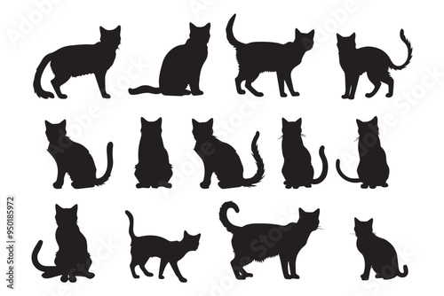 Collection of Cat Silhouettes in Various Poses Isolated on White Background